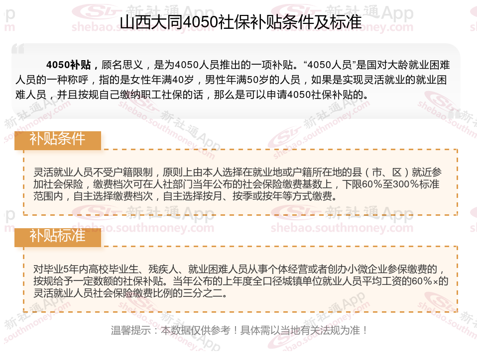 今天聊一下4050补贴的相关内容。4050补贴听起来像是一个针对特定年龄人群的社保补贴。比如女性需年满40周岁,男性需年满50周岁(以申请当年12月31日为截止日期)。那么山西大同4050灵活就业困难人员社保补贴多少钱?山西大同4050社保补贴可以申请吗?接下来随新社通APP小编具体了解一下4050社保补贴内容。