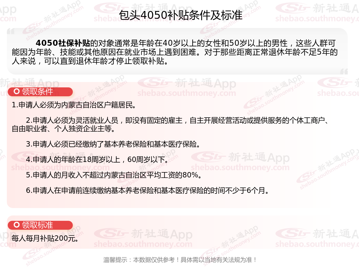 二、2025年包头4050社保补贴标准是多少?条件是什么?
