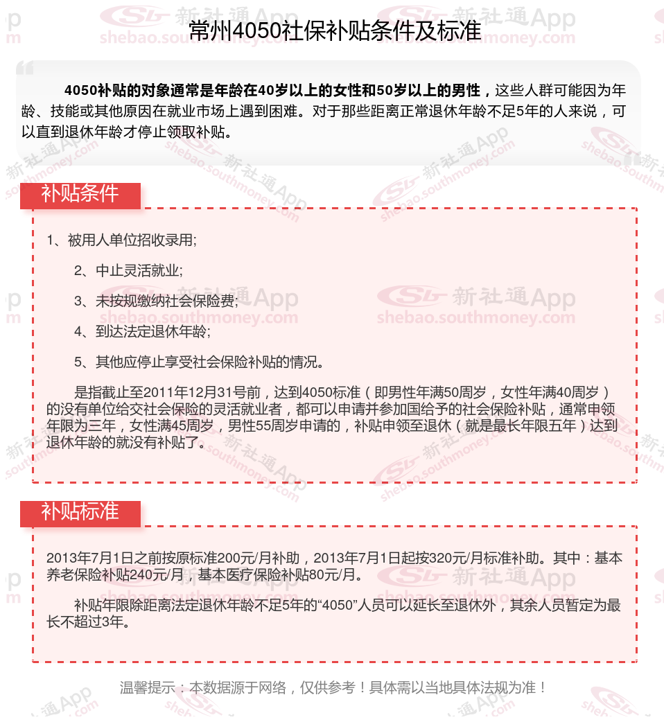 4050社保补贴标准据新社通app小编了解,通常,4050社保补贴包含基本医疗保险和基本养老保险两个险种,社保补贴金额为申请人实际缴纳基本养老保险和基本医疗保险金额的2/3,具体标准以当地社保局公布的数据为准!那么常州4050灵活就业困难人员社保补贴标准是多少?常州4050社保补贴需要符合什么条件?接下来随新社通APP小编具体了解一下4050社保补贴内容。