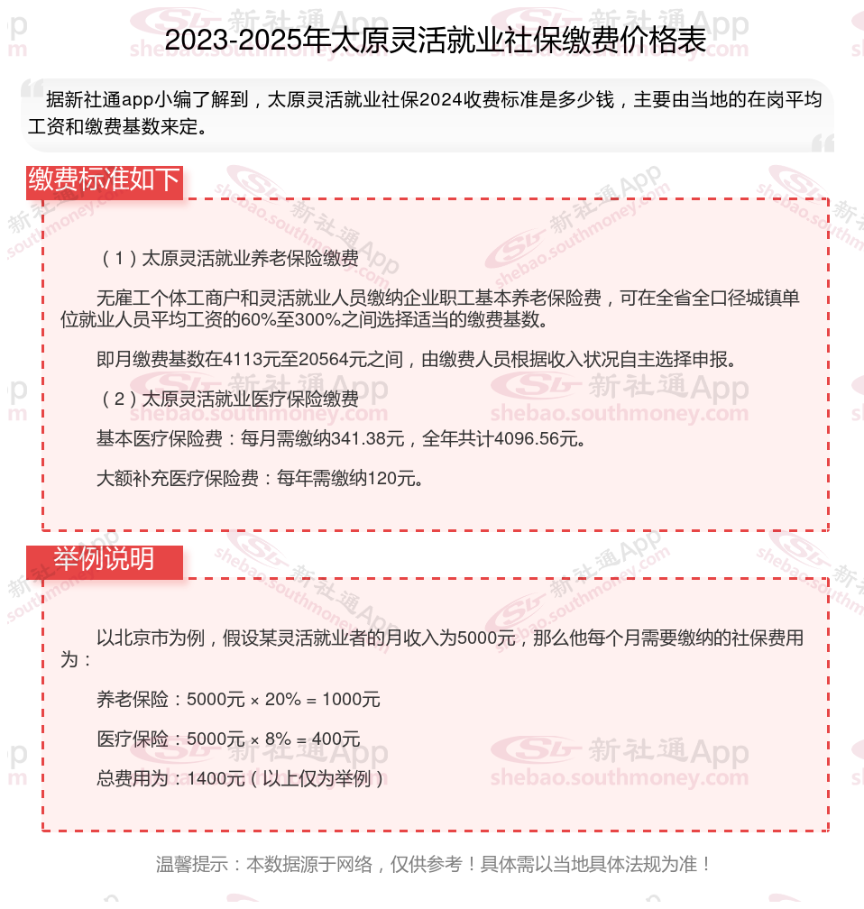 太原灵活就业人员参保月缴费金额是多少?2024-2025年度太原灵活就业人员社保缴费标准是多少?根据新社通app-社保缴费查询工具提供的2025社保缴费标准详情数据: