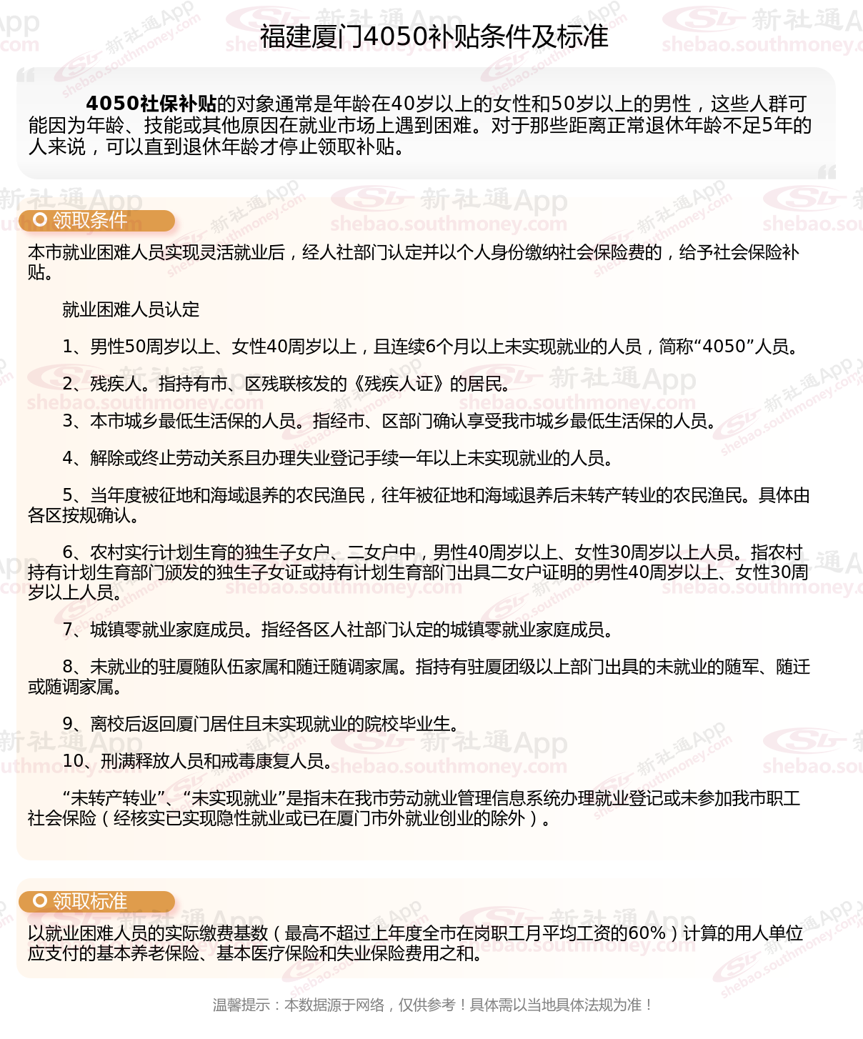二、2025年福建厦门4050社保补贴标准是多少?条件是什么?