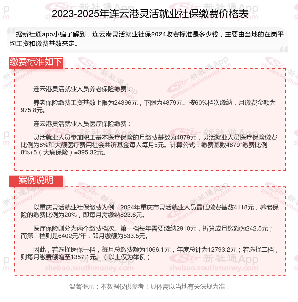 连云港灵活就业人员参保月缴费金额是多少?2024-2025年度连云港灵活就业人员社保缴费标准是多少?根据新社通app-社保缴费查询工具提供的2025社保缴费标准详情数据: