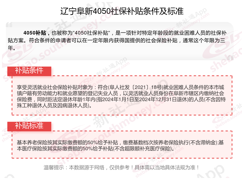 2025辽宁阜新灵活就业4050社保补贴是一项面向特定年龄段的就业困难人群的社会保险补贴。