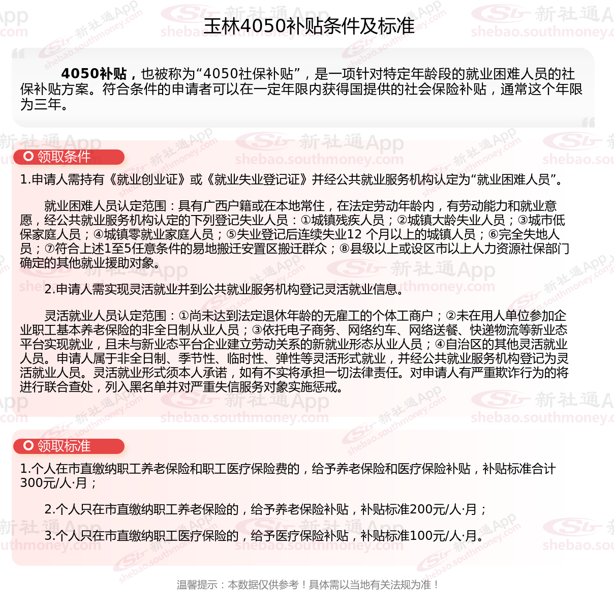二、玉林4050社保补贴标准及条件(2025年最新)