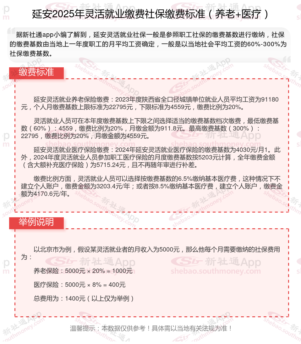 据新社通app数据显示,延安灵活就业养老保险缴费基数2024-2025年最新标准如下: