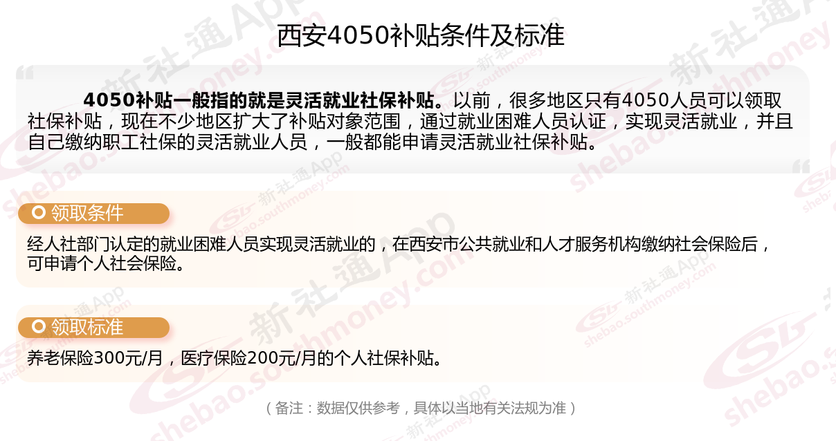 西安4050灵活就业社保补贴标准如何?“4050补贴”主要是针对大龄就业困难人群的社保补贴,申请条件包括年龄、就业困难、灵活就业并自费缴纳社保,需要持有失业登记证,不同地区可能有细微差别,比如农村户口的限制。那么西安4050灵活就业社保补贴标准是多少钱?西安4050社保补贴条件是什么?接下来随新社通APP小编了解一下西安4050灵活就业社保补贴标准最新资讯。
