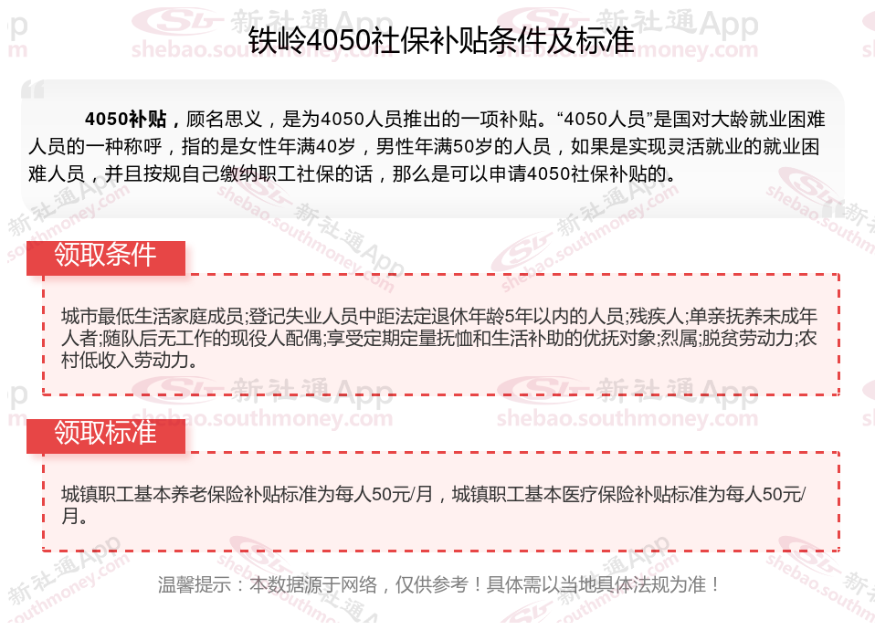 一、铁岭4050社保补贴标准及条件是多少?