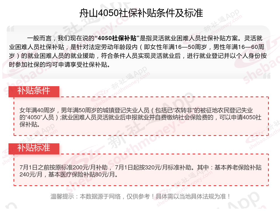 舟山4050灵活就业社保补贴是什么?今天聊一下4050补贴话题。4050补贴听起来像是一个针对特定年龄人群的社保补贴。比如女性需年满40周岁,男性需年满50周岁(以申请当年12月31日为截止日期)。那么舟山4050灵活就业社保补贴标准是多少钱?舟山4050社保补贴可以领取多少?接下来随新社通APP小编了解一下舟山4050灵活就业社保补贴的最新资讯。
