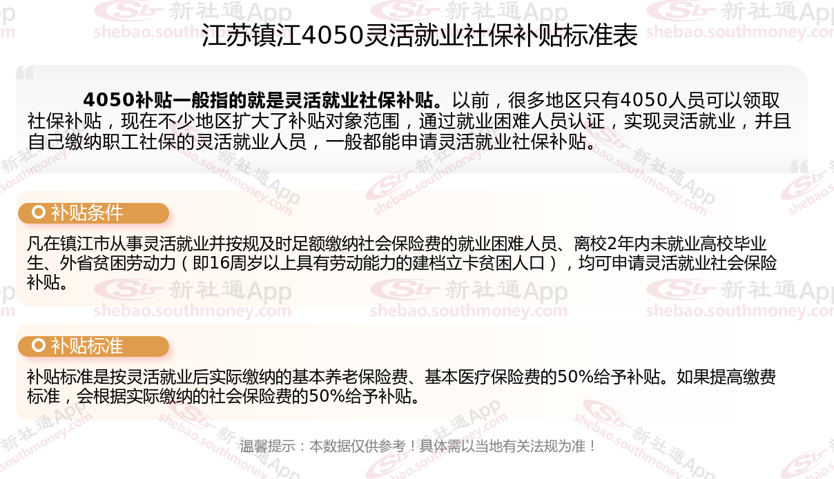 2025江苏镇江灵活就业4050社保补贴是一项面向特定年龄段的就业困难人群的社会保险补贴。