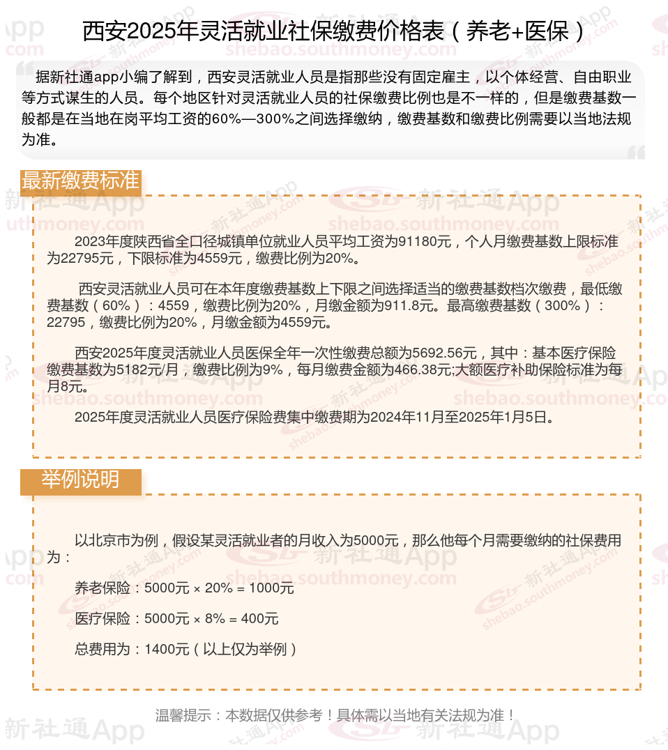 据新社通app数据显示,2024-2025年西安灵活就业人员养老保险的缴费标准是根据缴费基数来确定的: