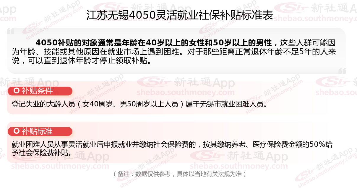 二、2025年江苏无锡4050社保补贴标准(江苏无锡4050灵活就业人员补贴标准是多少钱?江苏无锡2025年4050补贴新规能领多少钱?)