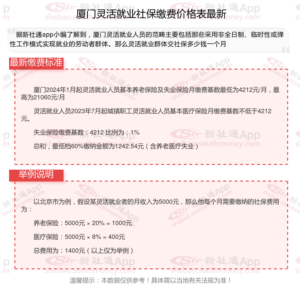 据新社通app数据显示,2024-2025年厦门灵活就业人员养老保险的缴费标准是根据缴费基数来确定的: