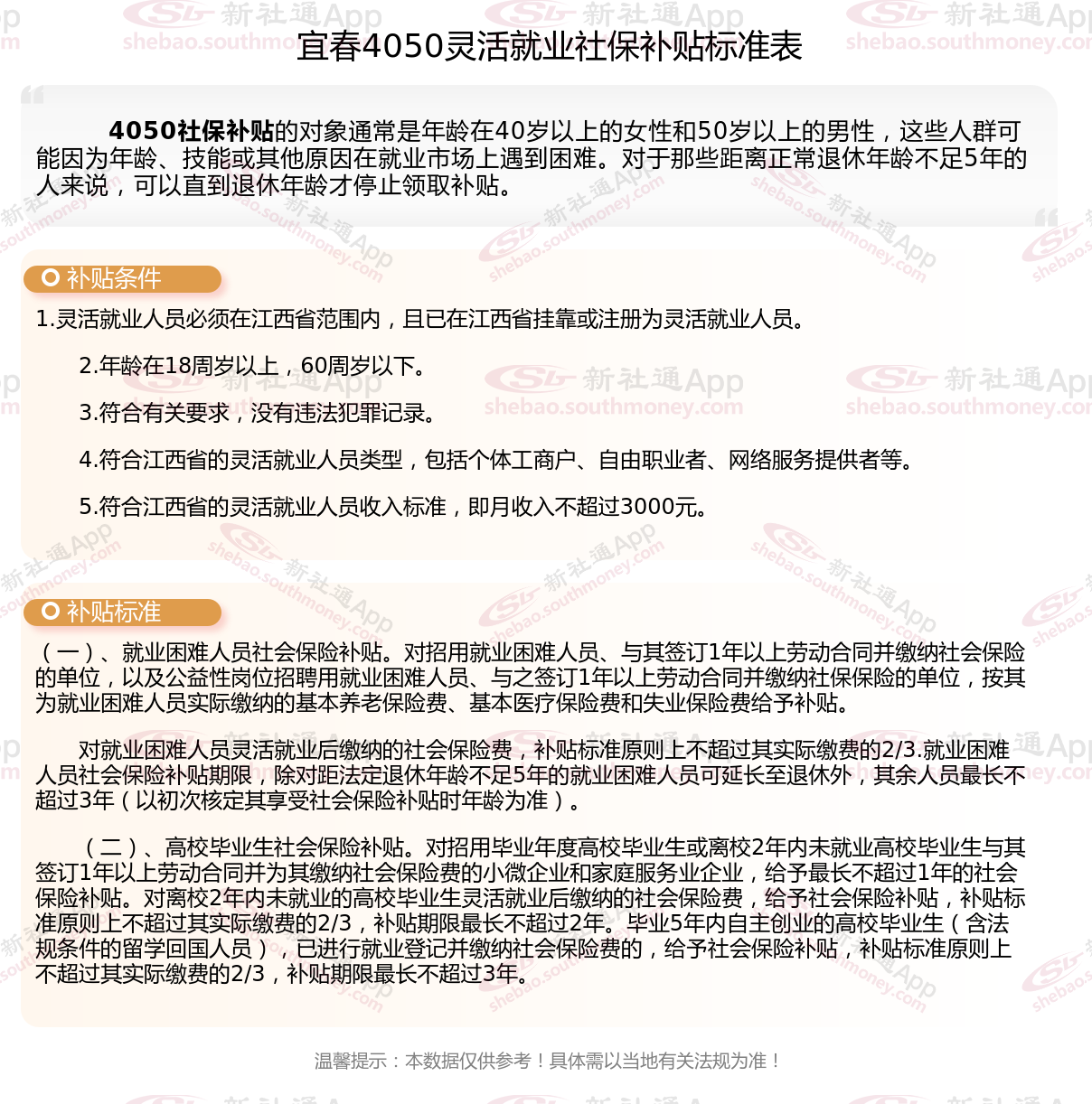 今天聊一下4050补贴话题。4050补贴听起来像是一个针对特定年龄人群的社保补贴。比如女性需年满40周岁,男性需年满50周岁(以申请当年12月31日为截止日期)。那么宜春4050灵活就业社保补贴标准是多少钱?宜春4050社保补贴条件是什么?接下来随新社通APP小编了解一下最新资讯。