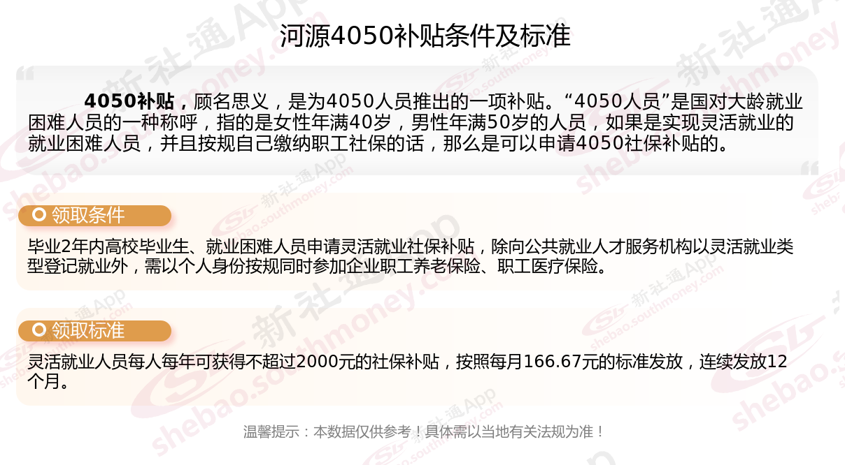 “灵活就业4050社保补贴”需要以灵活就业身份参加职工养老和医疗保险,补贴标准不超过实际缴费的三分之二,最长3年,距离退休不足5年的可延长到退休。补贴对象包括国企下岗人员、低保家庭等。申请流程需要提交身份证、银行账户等。那么河源4050灵活就业困难人员社保补贴标准是多少?河源4050社保补贴需要符合什么条件?接下来随新社通APP小编具体了解一下4050社保补贴内容。