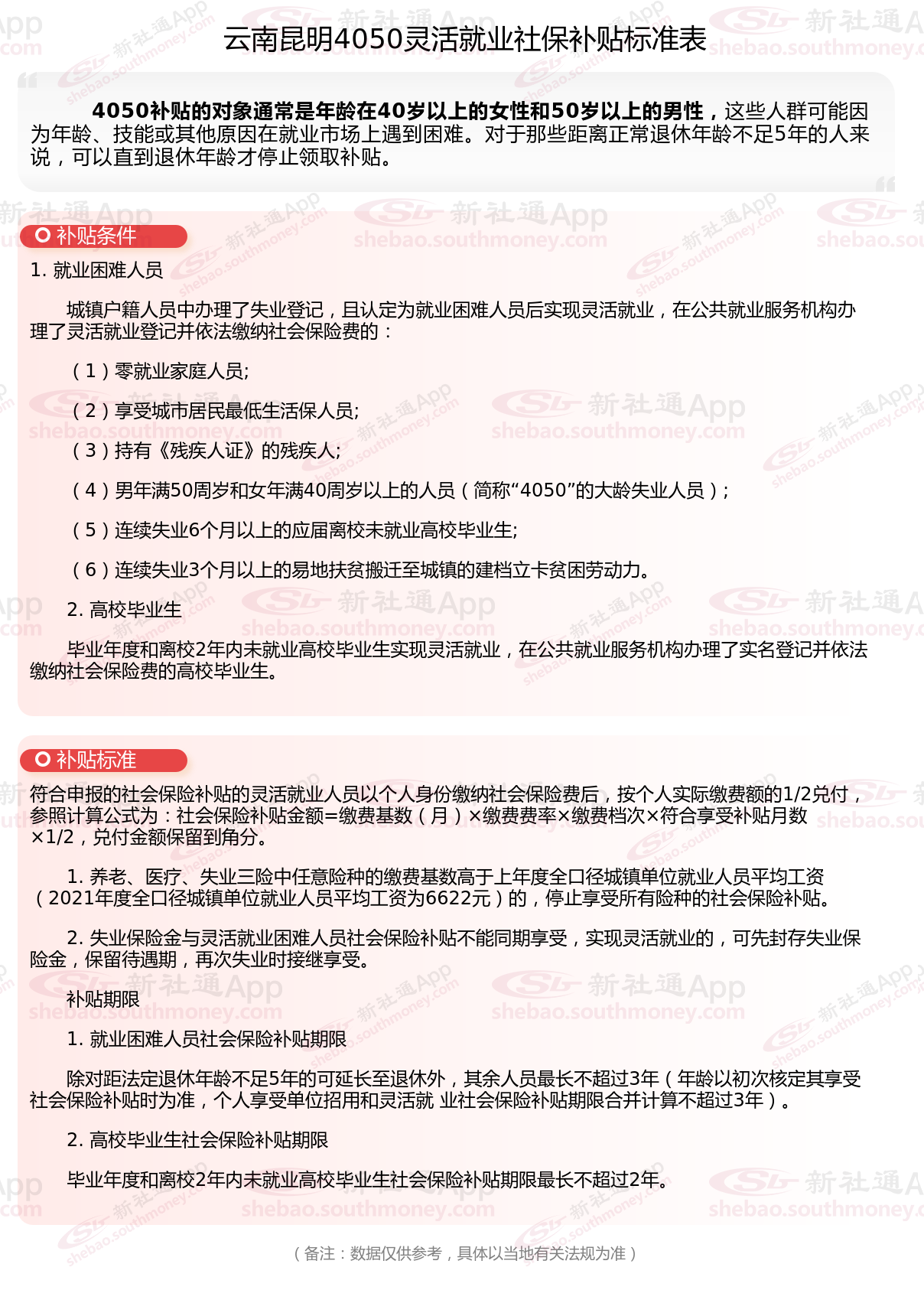 一、2023-2024年云南昆明灵活就业4050社保补贴标准和条件是什么