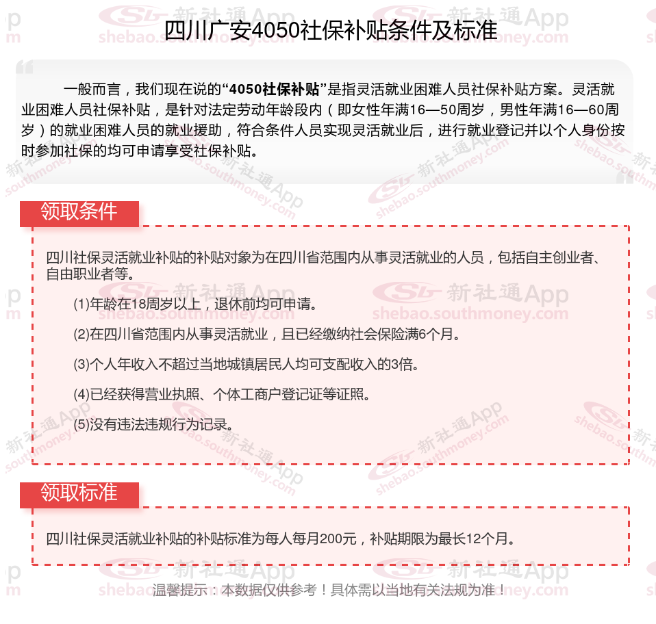 今天聊一下4050补贴的相关内容。4050补贴听起来像是一个针对特定年龄人群的社保补贴。比如女性需年满40周岁,男性需年满50周岁(以申请当年12月31日为截止日期)。那么四川广安4050灵活就业困难人员社保补贴多少钱?四川广安4050社保补贴可以申请吗?接下来随新社通APP小编具体了解一下4050社保补贴内容。