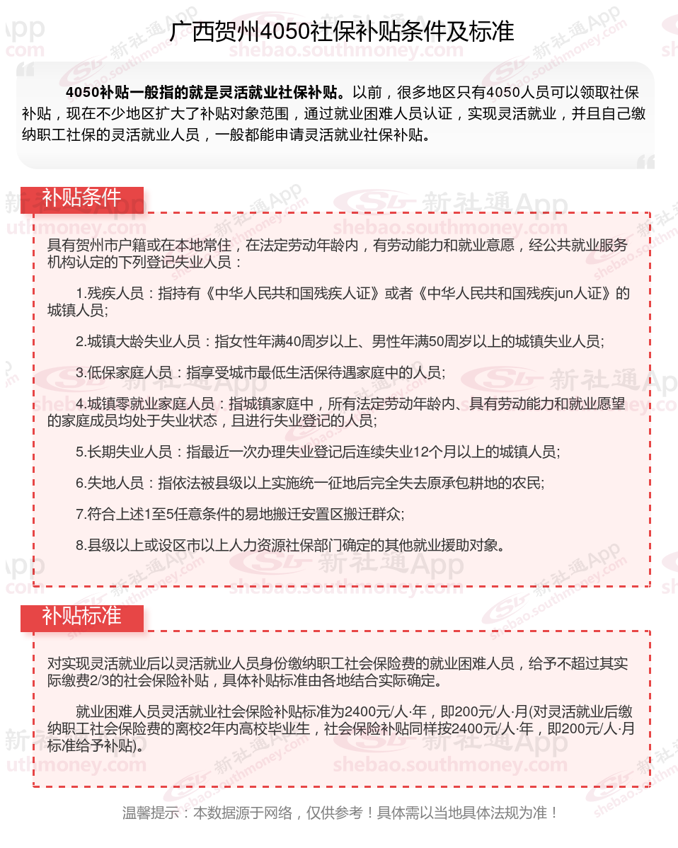 二、2025年广西贺州4050社保补贴标准及条件,最新如下: