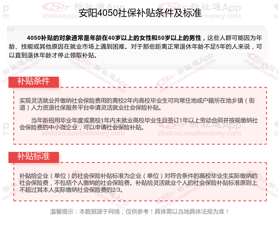 一、安阳4050社保补贴标准及条件2025年最新消息