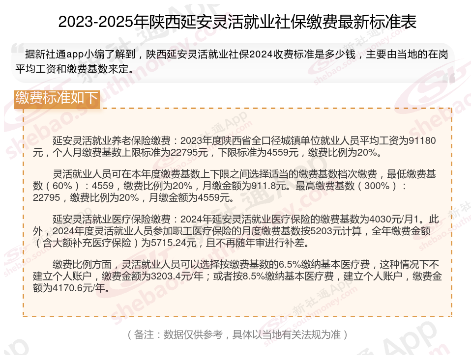 据新社通app数据显示,2024-2025年陕西延安灵活就业人员养老保险的缴费标准:
