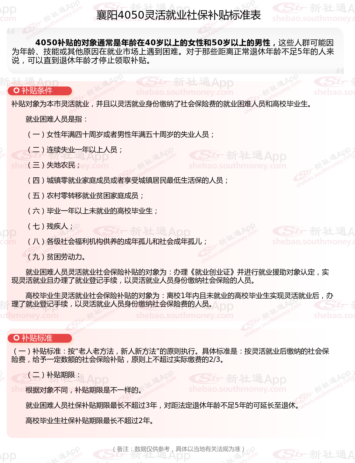 2025襄阳灵活就业4050社保补贴是一项面向特定年龄段的就业困难人群的社会保险补贴。