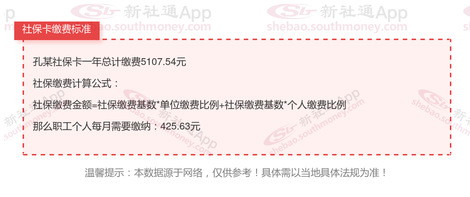 由上图得知,孔某社保卡一年需要缴纳5107.54元,职工个人月缴纳425.63元,若您想要了解明细点击新社通社保计算器,来了解一下明细吧。