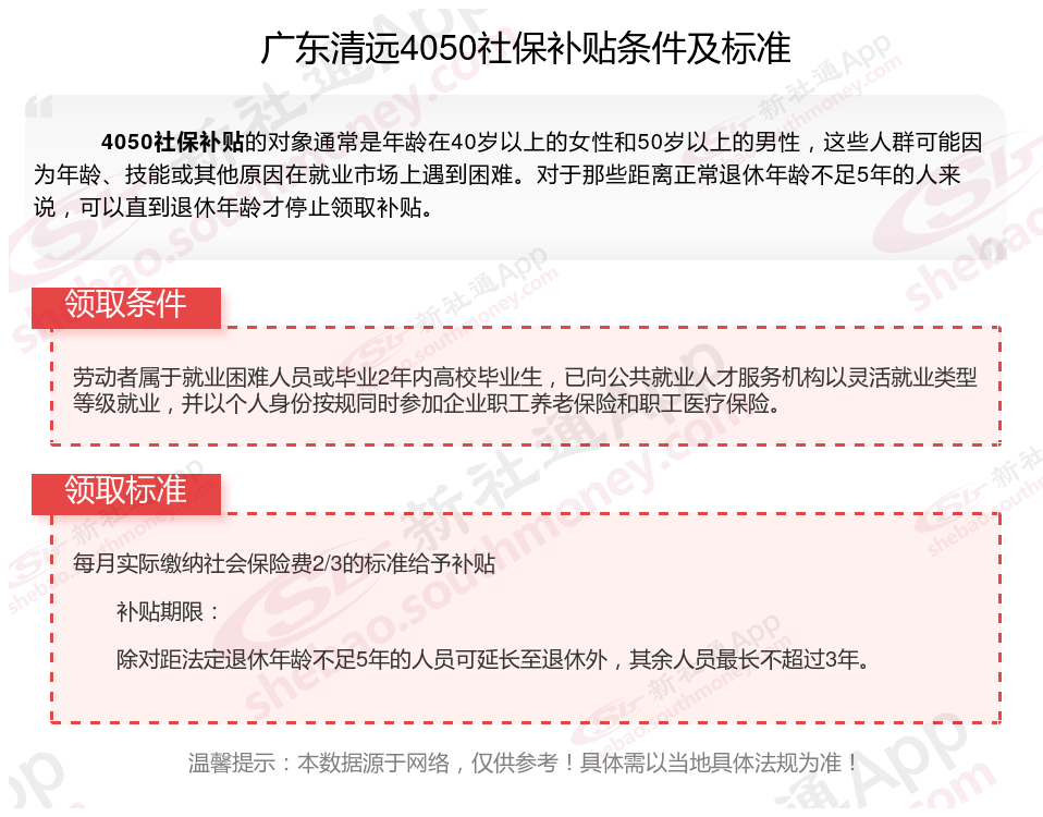 一、广东清远4050社保补贴标准及条件2025年最新消息