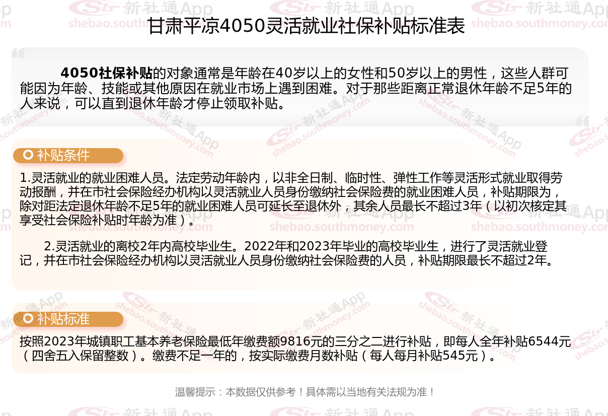 二、2025年甘肃平凉4050社保补贴标准及条件,最新如下: