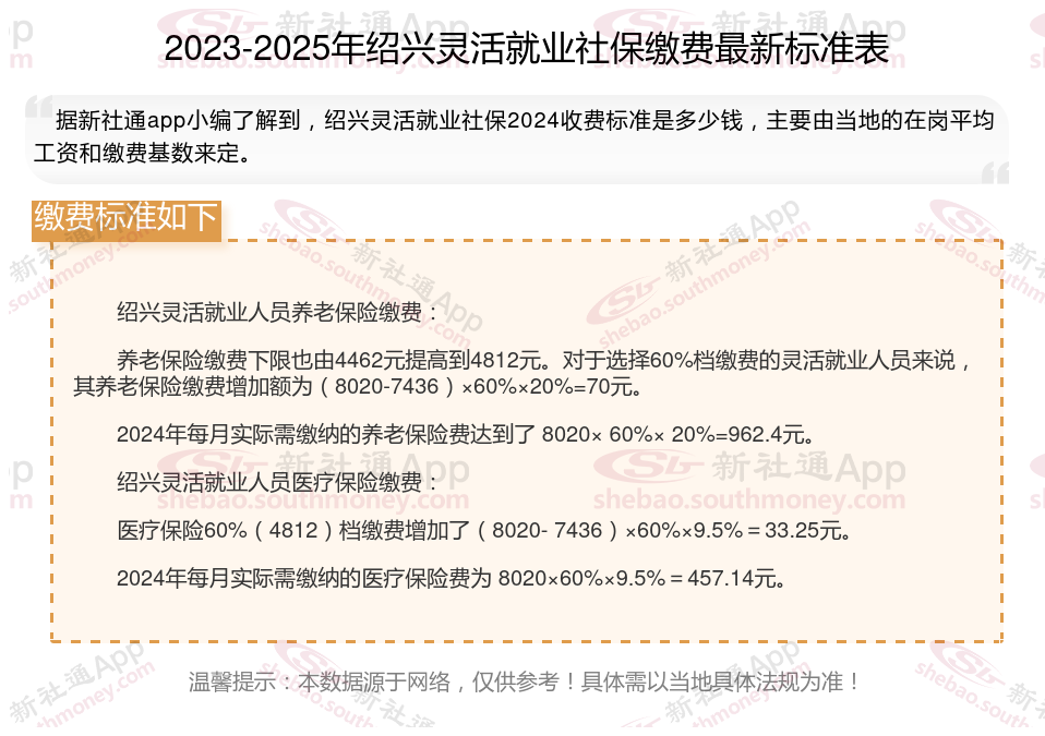 绍兴灵活就业人员的社保缴费标准是多少?根据新社通app-社保缴费查询工具提供的最新数据如下: