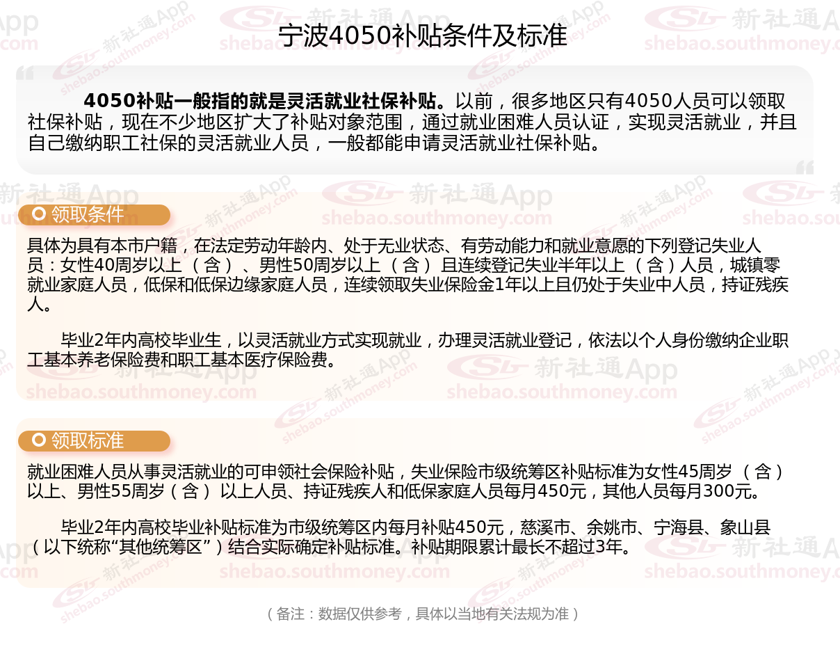 今天聊一下4050补贴话题。4050补贴听起来像是一个针对特定年龄人群的社保补贴。比如女性需年满40周岁,男性需年满50周岁(以申请当年12月31日为截止日期)。那么宁波4050灵活就业社保补贴标准是多少钱?宁波4050社保补贴条件是什么?接下来随新社通APP小编了解一下最新资讯。