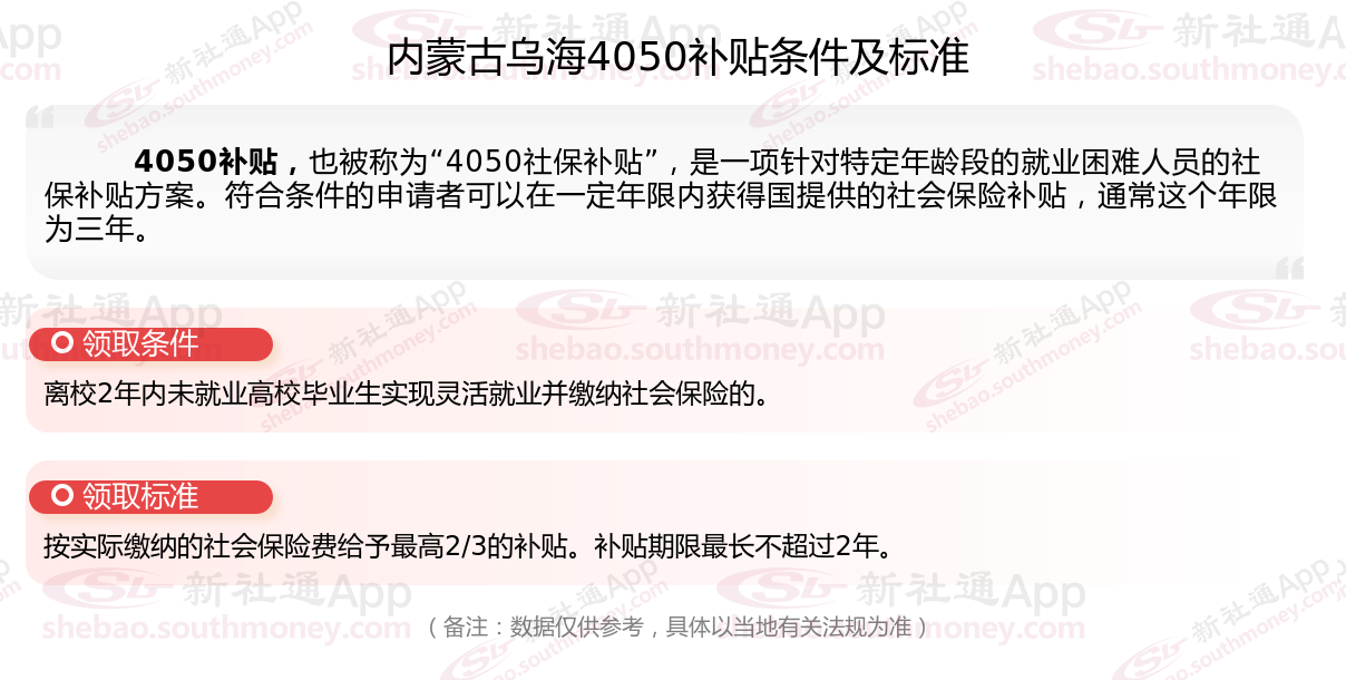 二、2025年内蒙古乌海4050社保补贴标准(内蒙古乌海4050灵活就业人员补贴标准是多少钱?内蒙古乌海2025年4050补贴新规能领多少钱?)