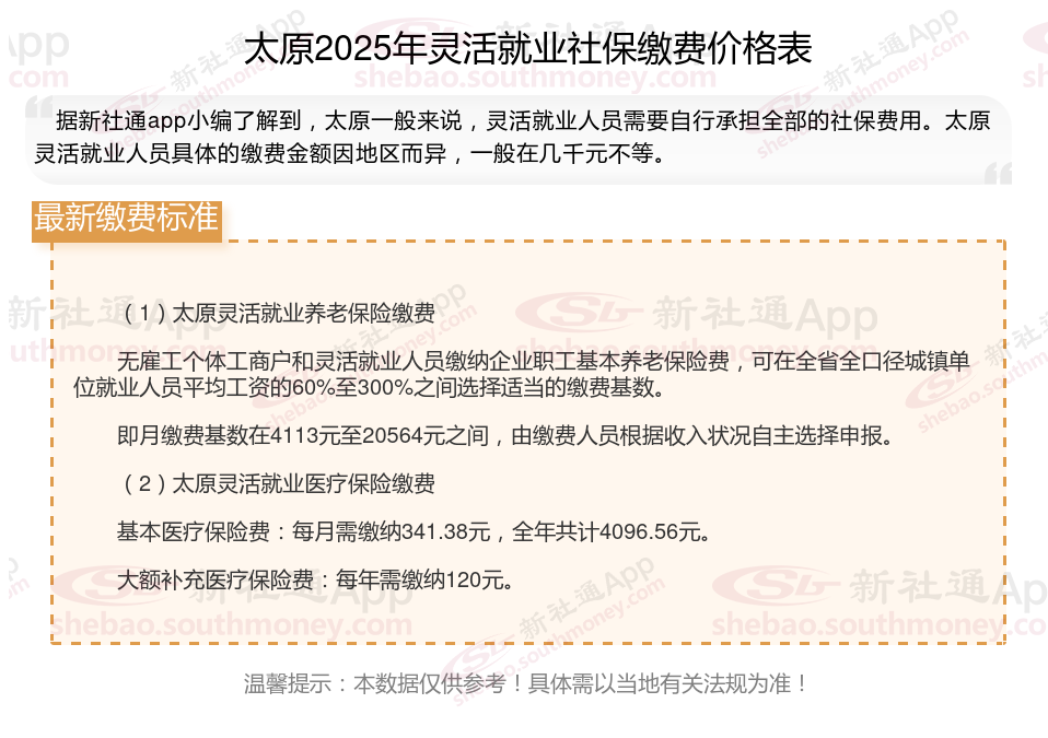据新社通app数据显示,太原灵活就业人员养老缴费基数2024-2025年最新标准如下:
