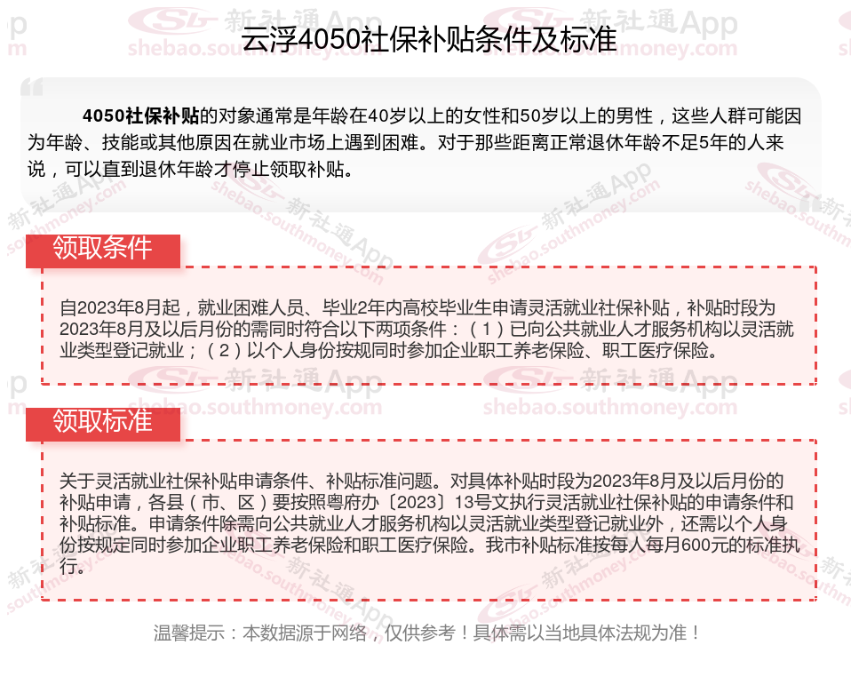 2025云浮4050补贴主要针对的是年龄在40岁以上的女性和50岁以上的男性,这些人群通常因为年龄较大而面临就业困难。