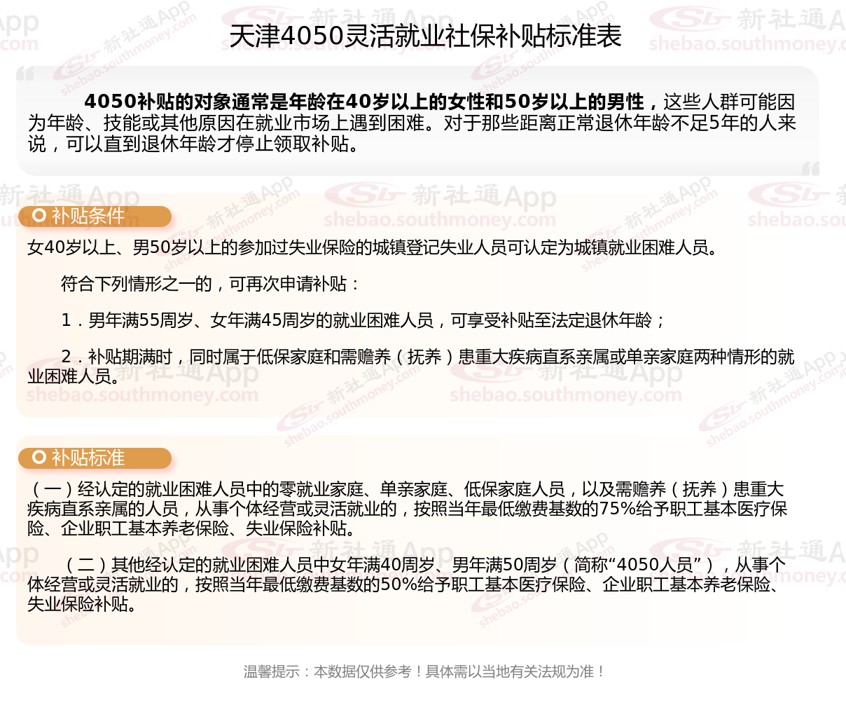 二、2025年天津4050社保补贴标准及条件,最新如下: