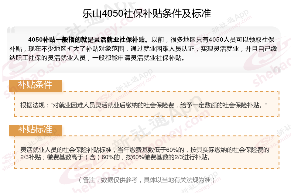 今天聊一下4050补贴的相关内容。4050补贴听起来像是一个针对特定年龄人群的社保补贴。比如女性需年满40周岁,男性需年满50周岁(以申请当年12月31日为截止日期)。那么乐山4050灵活就业困难人员社保补贴多少钱?乐山4050社保补贴可以申请吗?接下来随新社通APP小编具体了解一下4050社保补贴内容。