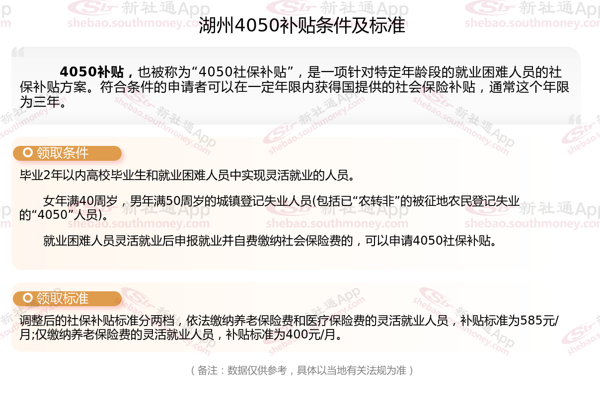 一、2025年湖州4050社保补贴标准及条件是多少?
