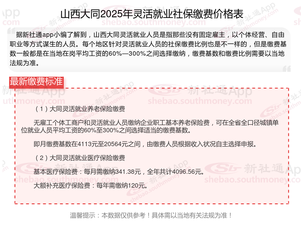山西大同灵活就业人员的社保缴费标准是多少?根据新社通app-社保缴费查询工具提供的最新数据如下:
