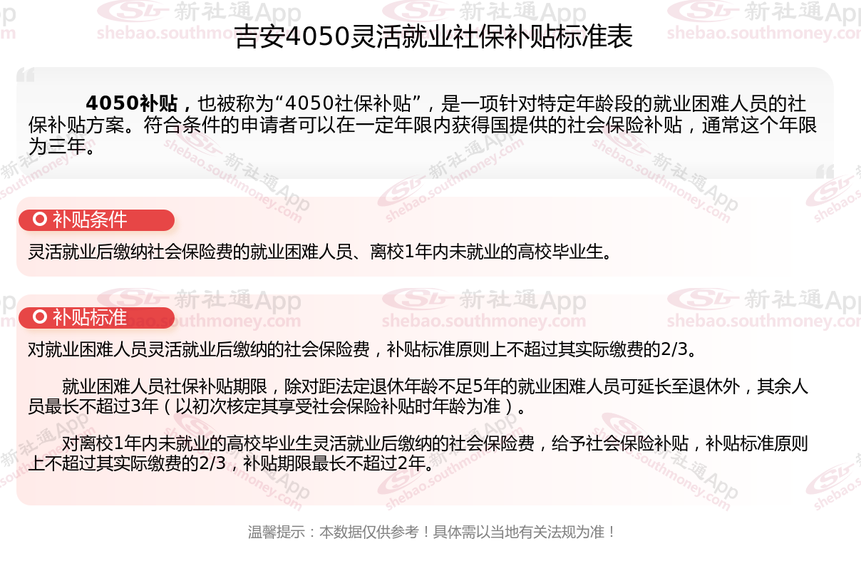 二、2025年吉安4050社保补贴标准及条件(4050社保补贴多少钱?)