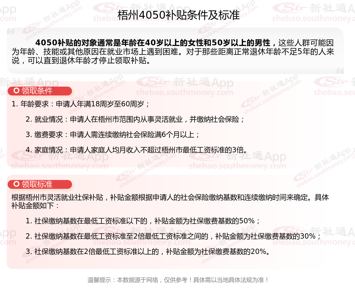 2025梧州4050补贴主要针对的是年龄在40岁以上的女性和50岁以上的男性,这些人群通常因为年龄较大而面临就业困难。