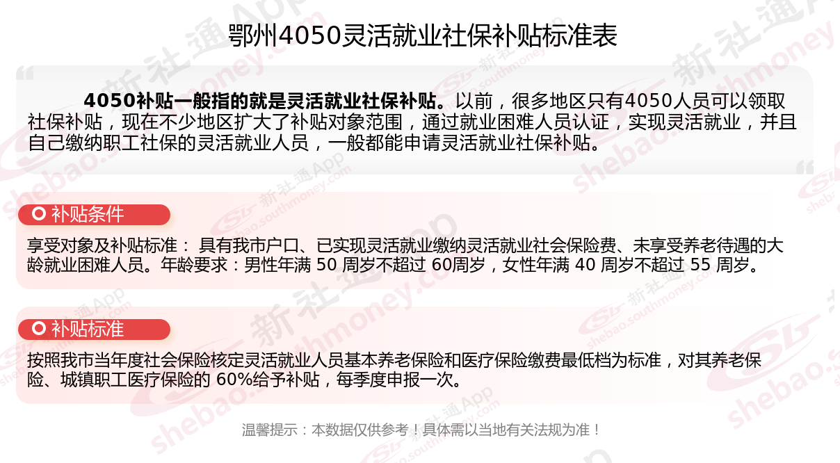 一、2023-2024年鄂州灵活就业4050社保补贴标准和条件是什么