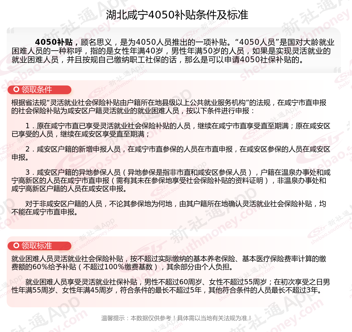 二、2025年湖北咸宁4050社保补贴标准及条件,最新如下: