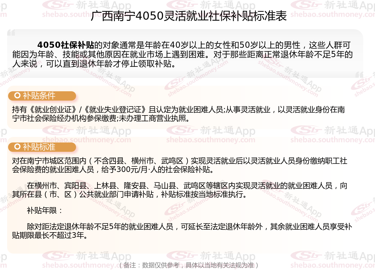 2025广西南宁4050补贴主要针对的是年龄在40岁以上的女性和50岁以上的男性,这些人群通常因为年龄较大而面临就业困难。