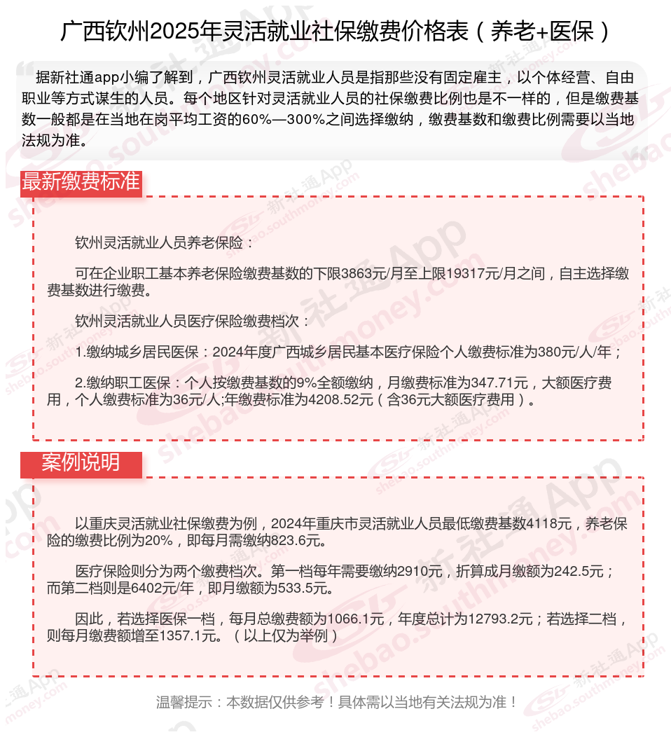 二、广西钦州2024-2025年灵活就业社保缴费基数、比例最新消息