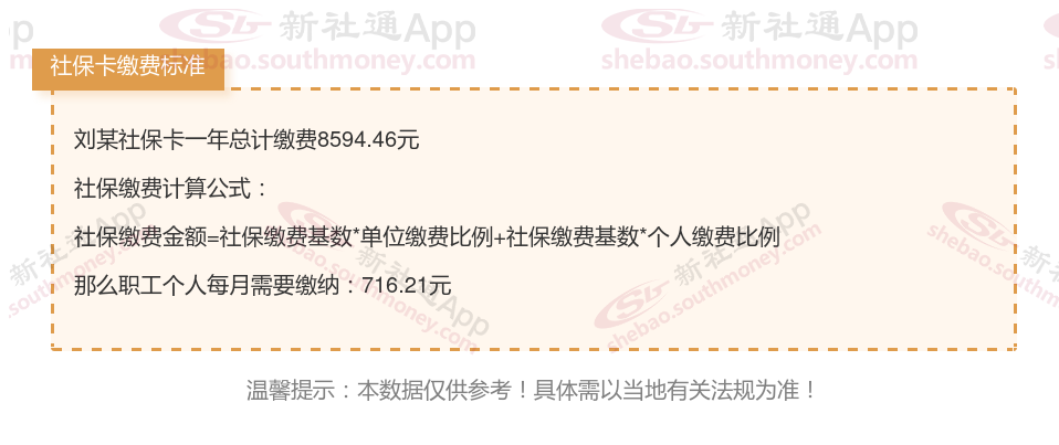 由上图得知,刘某社保卡一年需要缴纳8594.46元,个人部分每月需要缴纳716.21元,若您想要了解明细点击新社通社保计算器,来了解一下明细吧。