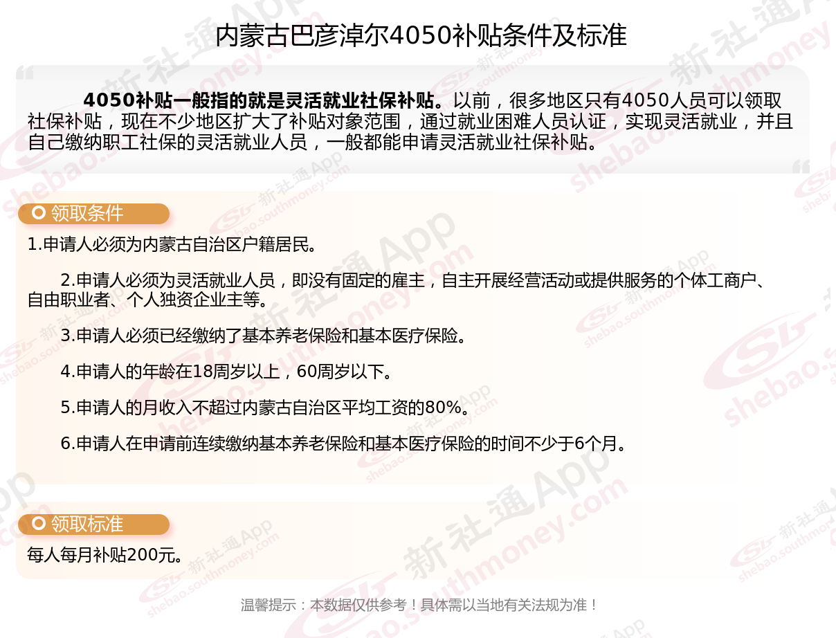 二、2025年内蒙古巴彦淖尔4050社保补贴标准是多少?领取条件是什么?