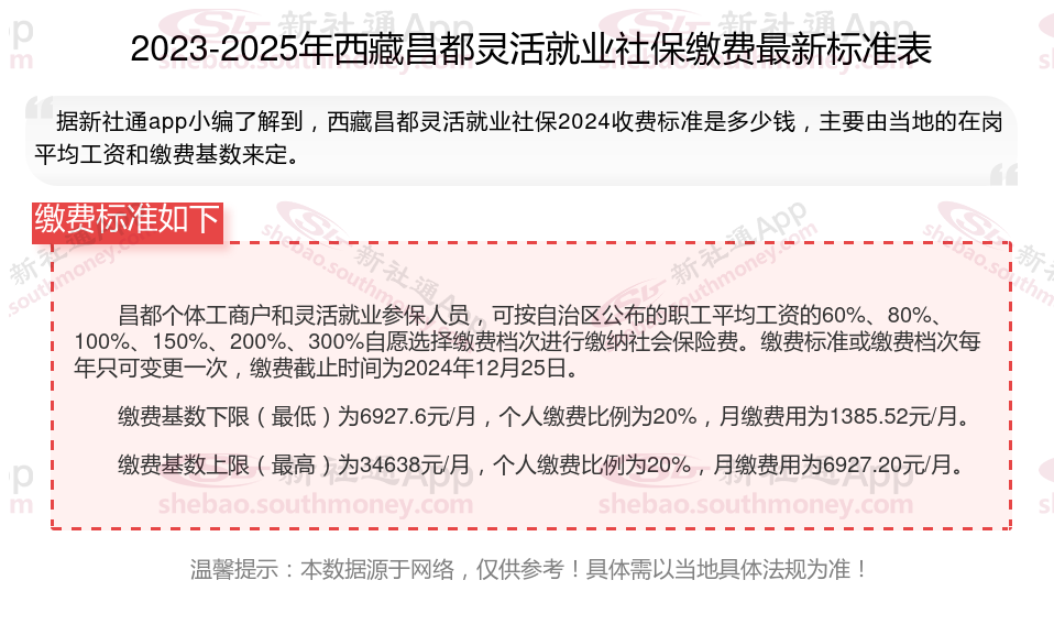 据新社通app数据显示,西藏昌都灵活就业养老保险最低缴费基数为:6927.6元;个人的缴费比例分别为:20%;