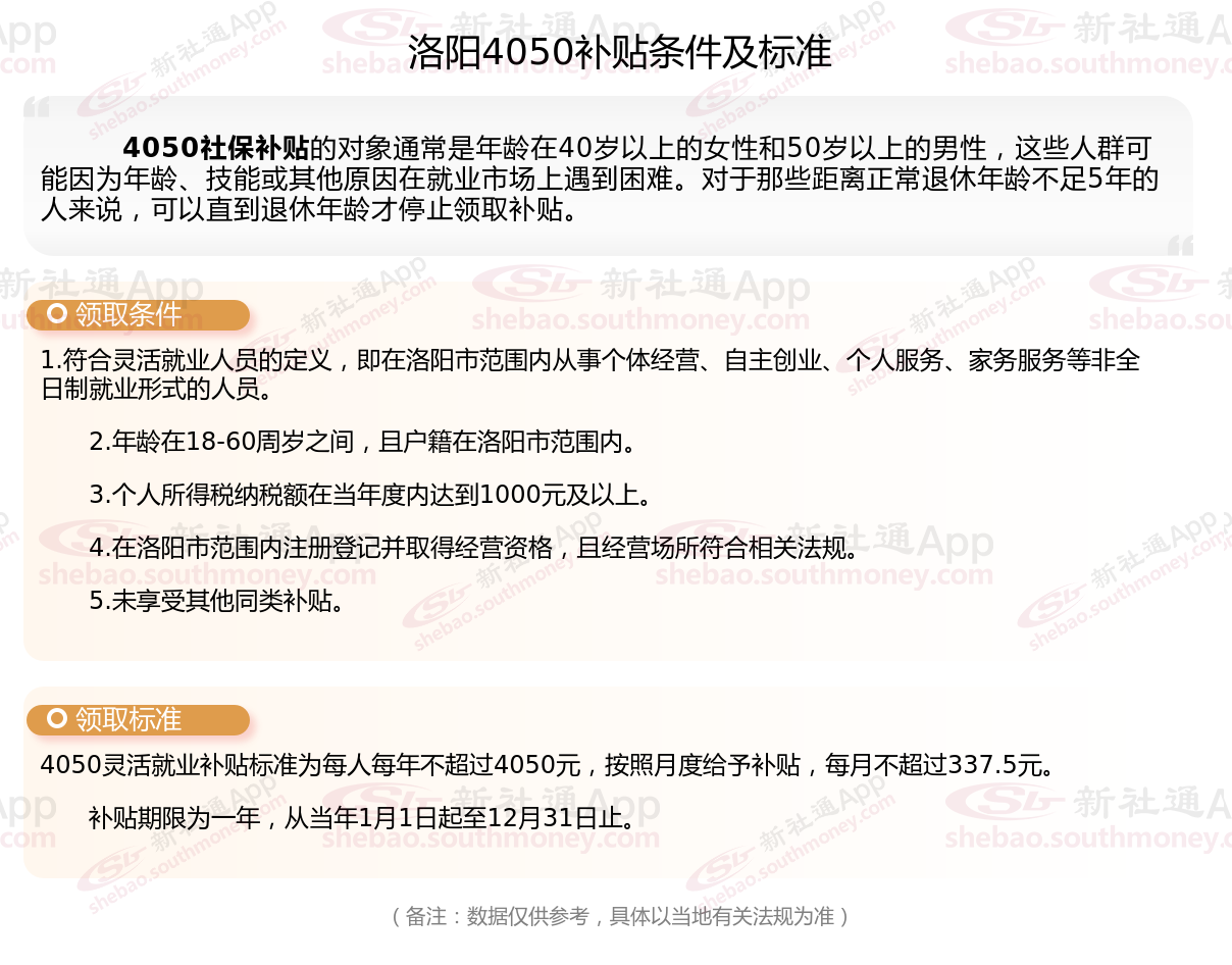 4050补贴主要是针对大龄就业困难人群的社保补贴,申请条件包括年龄、就业困难、灵活就业并自费缴纳社保,需要持有失业登记证,不同地区可能有细微差别,比如农村户口的限制。那么洛阳4050灵活就业社保补贴标准是多少钱?洛阳4050社保补贴条件是什么?接下来随新社通APP小编了解一下最新资讯。