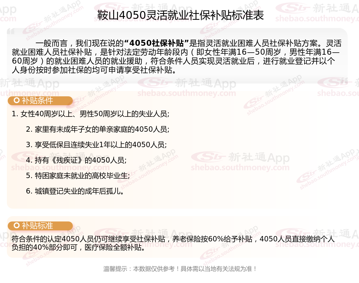 二、2025年鞍山4050社保补贴标准及条件,最新如下:
