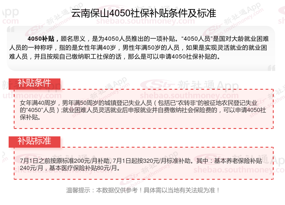 一、2025年云南保山4050社保补贴标准及条件是多少?