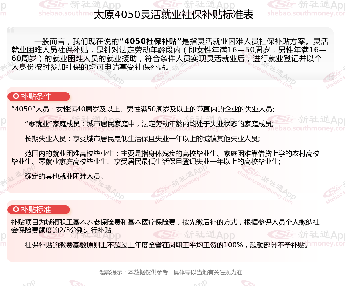 2025太原4050补贴主要针对的是年龄在40岁以上的女性和50岁以上的男性,这些人群通常因为年龄较大而面临就业困难。