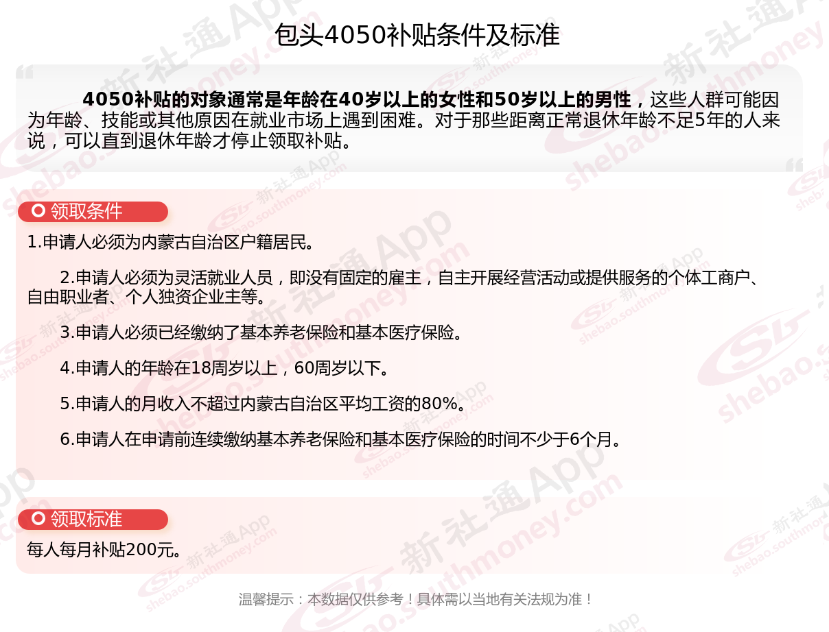 4050社保补贴标准据新社通app小编了解,通常,4050社保补贴包含基本医疗保险和基本养老保险两个险种,社保补贴金额为申请人实际缴纳基本养老保险和基本医疗保险金额的2/3,具体标准以当地社保局公布的数据为准!那么包头4050灵活就业困难人员社保补贴标准是多少?包头4050社保补贴需要符合什么条件?接下来随新社通APP小编具体了解一下4050社保补贴内容。